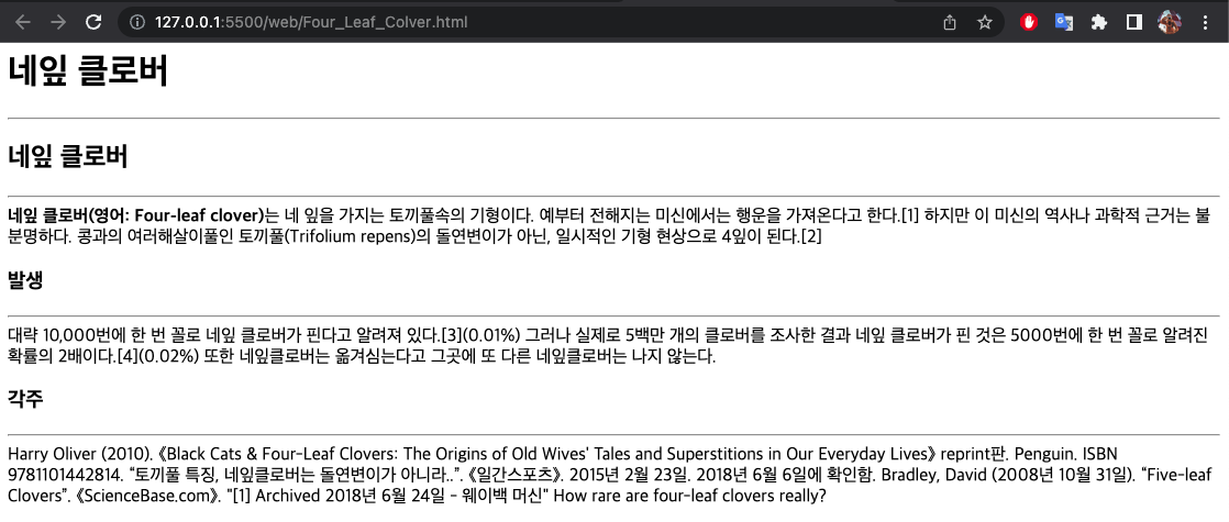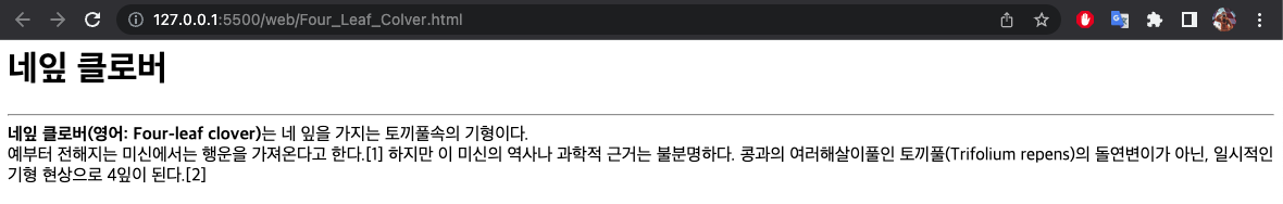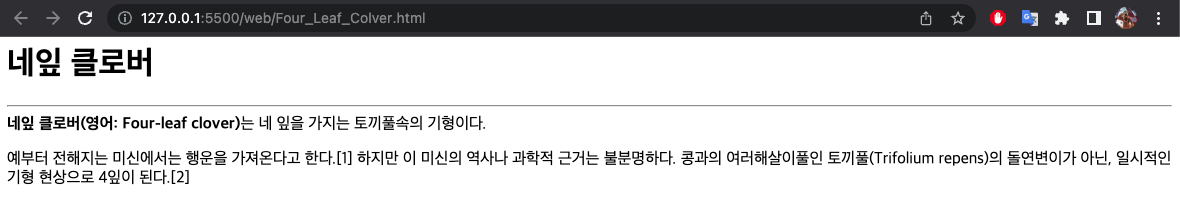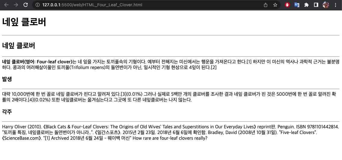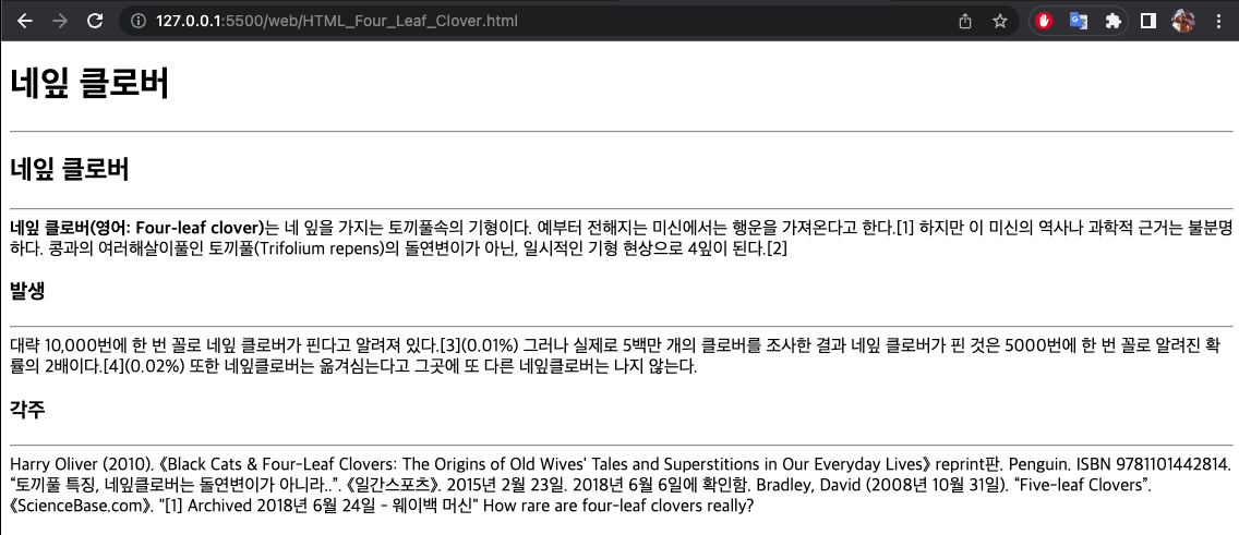ㄴ> HTML 상용구에 맞춰 네잎 클로버 페이지를 만들려면 위와 같이 코드를 작성해야 합니다.