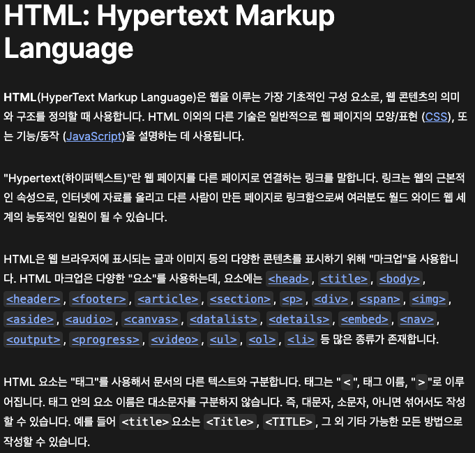 : HTML은 웹 페이지라는 문서에 마크업을 하기 위한 마크업 언어입니다.