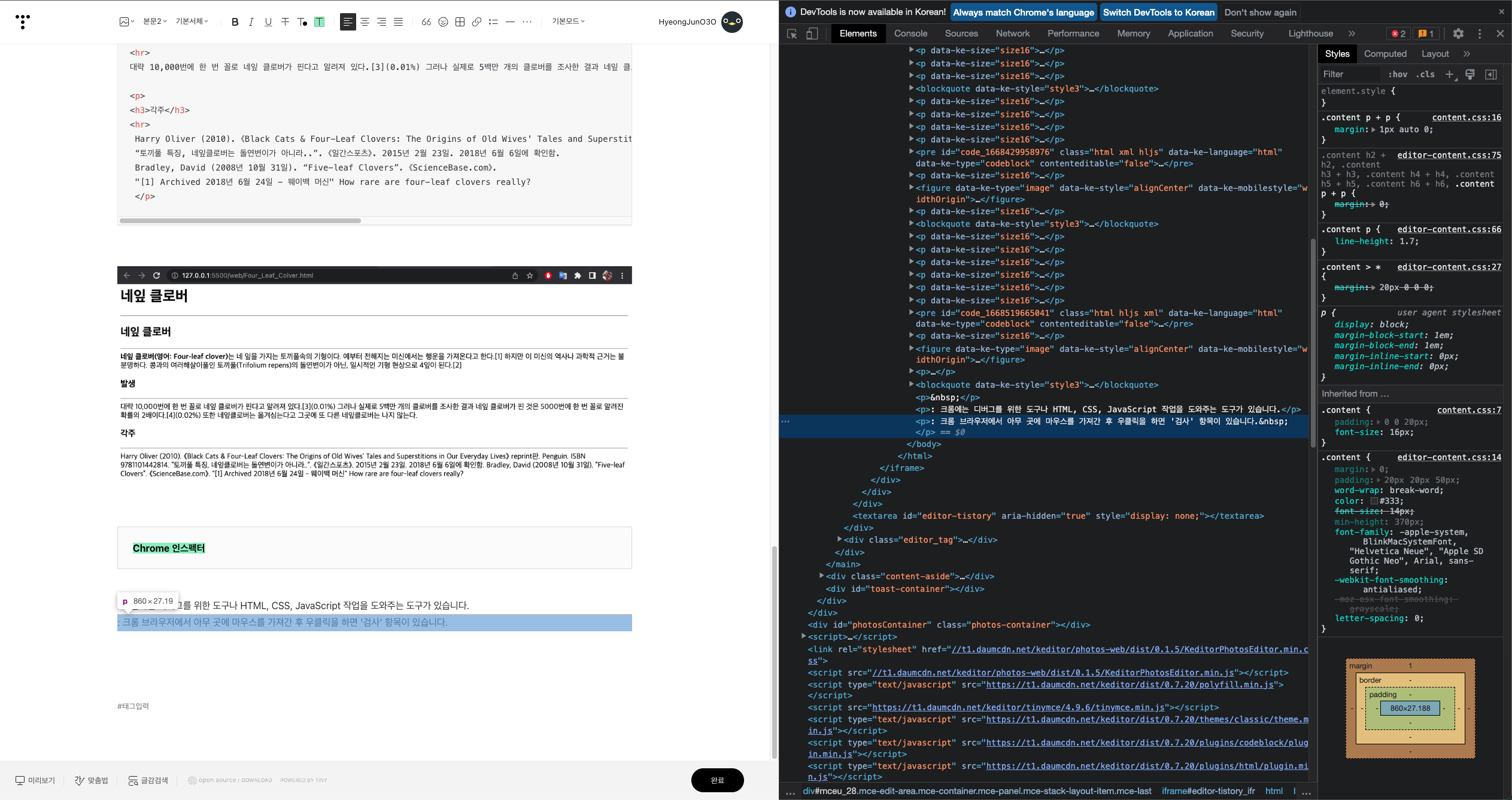 : 크롬에는 디버그를 위한 도구나 HTML, CSS, JavaScript 작업을 도와주는 도구가 있습니다.