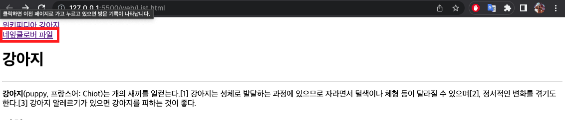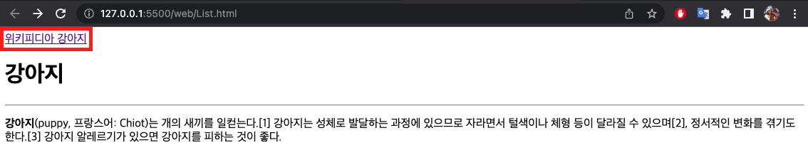 ex) <a href="https://ko.wikipedia.org/wiki/%EA%B0%95%EC%95%84%EC%A7%80"> 위키피디아 강아지 </a>