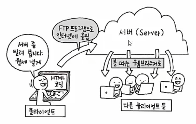 - HTML 로 만든 웹 사이트를 다른 사람이 볼 수 있도록 하려면 웹 문서와 사용한 파일들을 서버 컴퓨터로 업로드해야 한다.